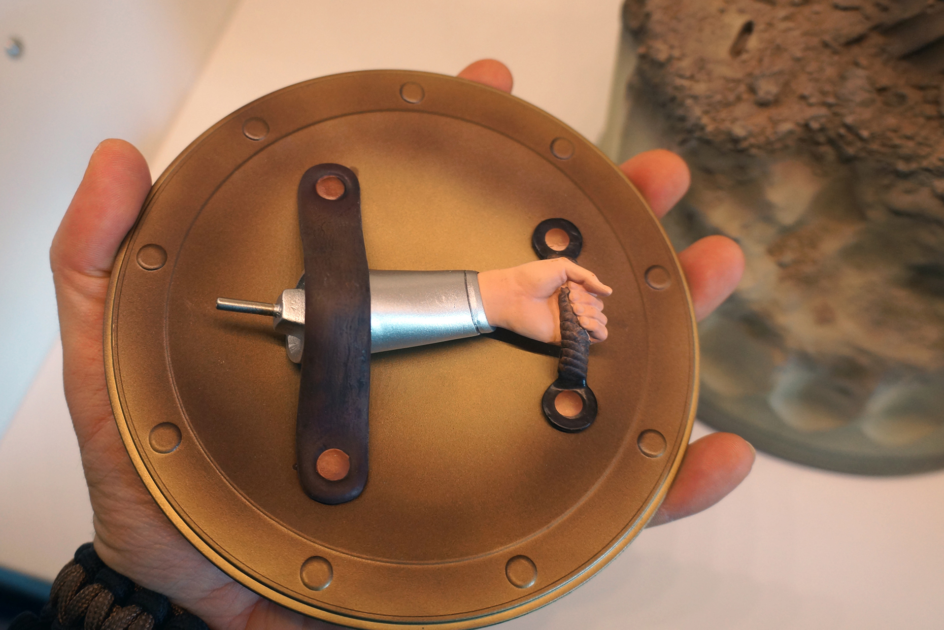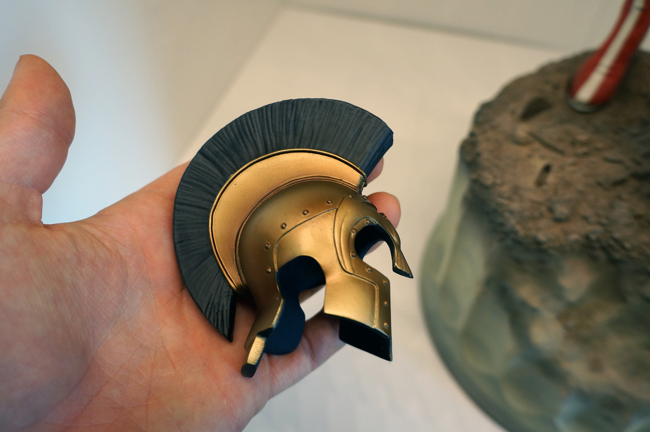 Même si je la trouve magnifique et que je regrette pas mon achat je note tout de même que c'est une vraie pu**** de galère pour la monter sans rien casser ! Parce qu'il faut vraiment forcer comme un boeuf pour que les pièces s’emboîtent ! En plus j'ai du faire un trou avec un mini clou car il était mal formé pour l'épée planté dans le socle et le casque ne tiens pas bien. Il est juste posé alors qu'il se cale parfaitement, si on appuis dessus, mais sans pression il sort légèrement des emplacement. Du coup, je sens que je vais le coller proprement tout comme le draper en plastique au bout de la lance qui est arrivé casser au niveau de la fixation :/