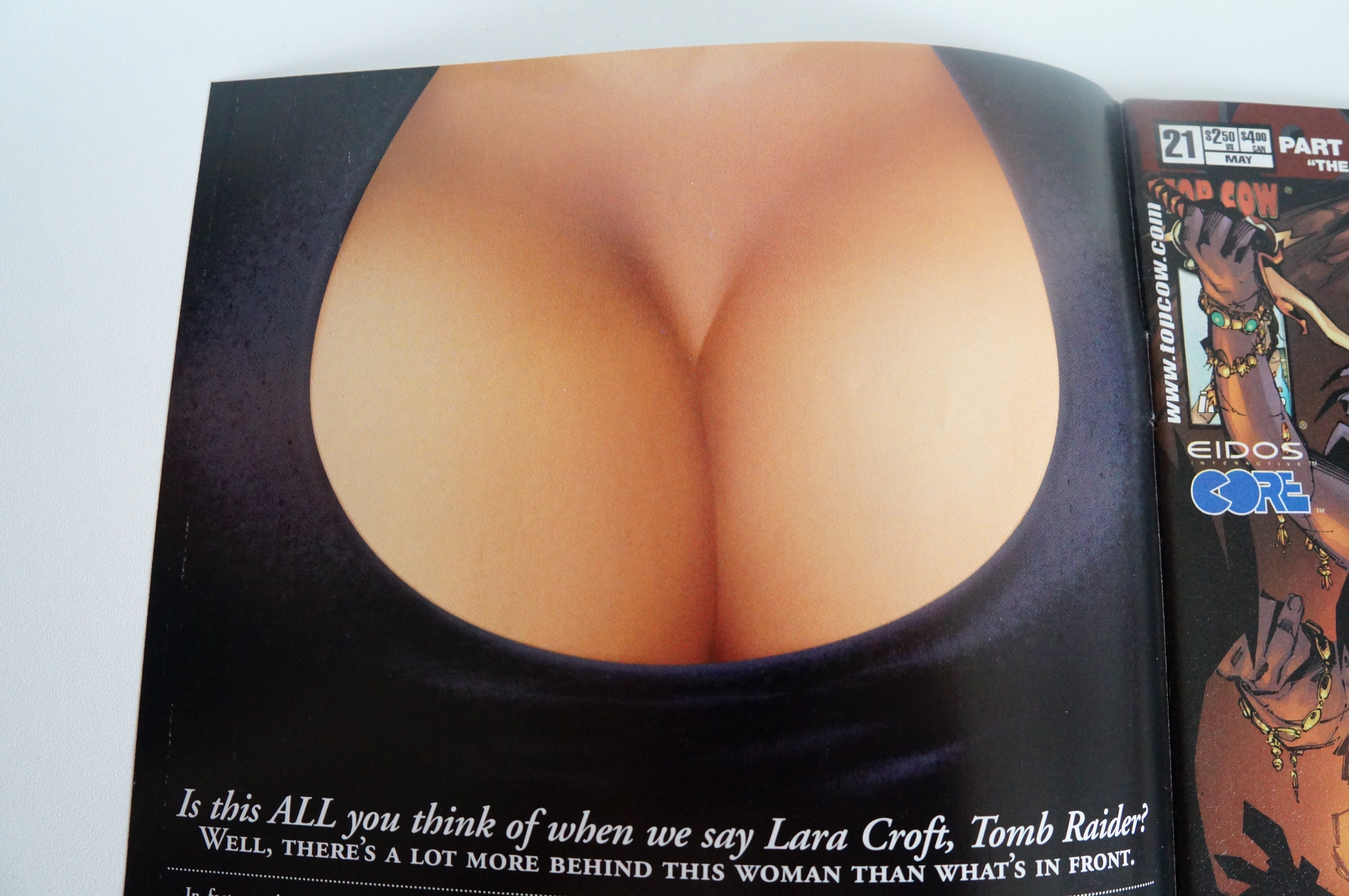 Pour les anglophobes c'est écrit " C'est a ça ce que vous pensez lorsque l'on dit Lara Croft ou Tomb raider ? Et bien sachez qu'il y a bien plus derrière cette femme (son histoire) que ce qu'elle a devant (ses nichons)"