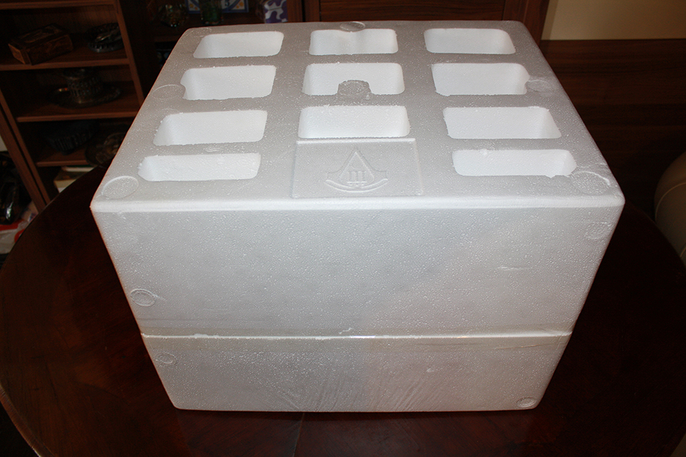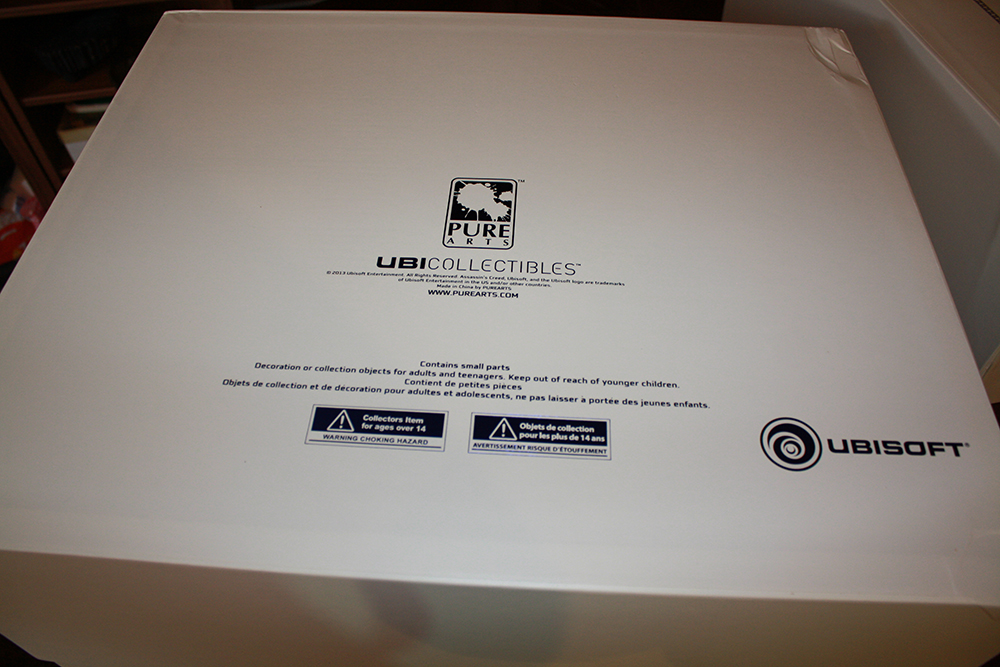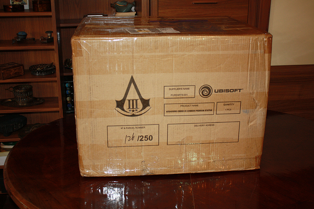 Voici la boîte de transport, vous pouvez apercevoir le logo d’Assassin’S Creed 3, le numéro de la statue, le logo d’Ubisoft et le nom de l’entreprise Pure Arts.