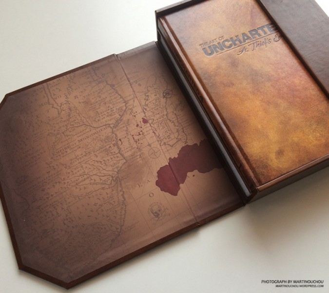 Mais le plus beau commence une fois que l’on soulève le couvercle aimanté et qu’on découvre le contenu du coffret ! Avec comme toujours pour les produits Uncharted 4, la carte de Madagascar sur le fourreau, et enfin l’artbook !