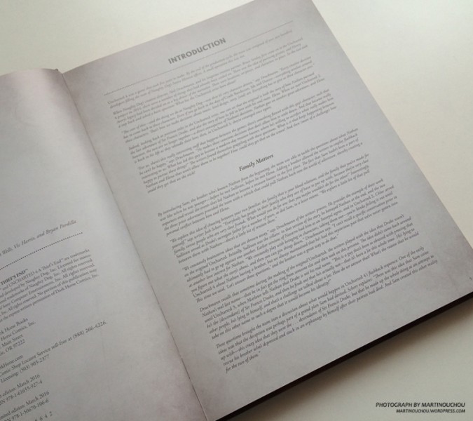 A l’intérieur, on retrouve une « petite » introduction de plusieurs pages, qui est plus qu’intéressante, retraçant tout le processus de développement du jeu derrière les yeux de Neil Druckman, Bruce Straley et Josh Scherr. Ils parlent par exemple d’à quel point The Last of Us leur a permis d’apporter de nouvelles choses sur Uncharted, mais aussi de ce qu’ils avaient imaginés différemment pour Uncharted 4 – notamment en terme de scénario – avant de finalement trouver le résultat final.