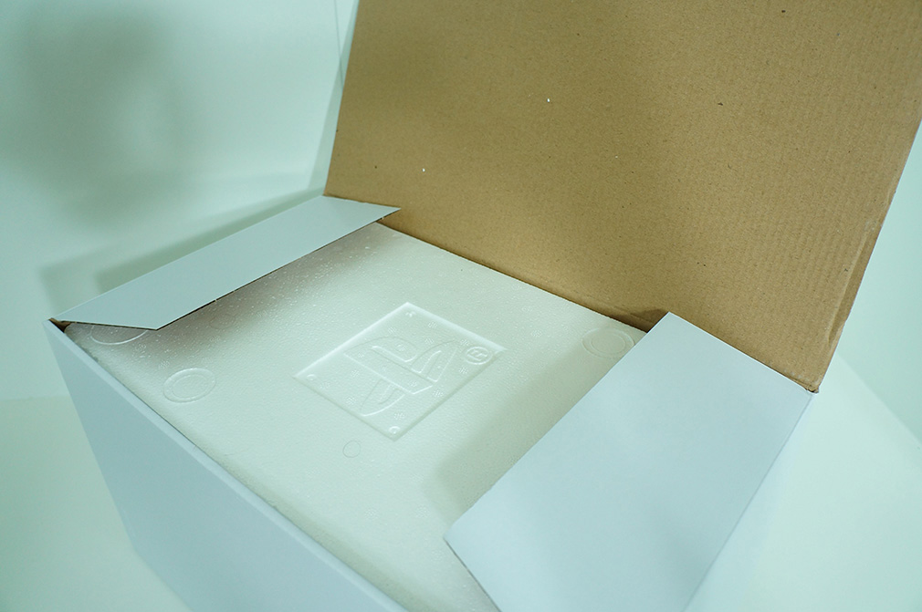 Viens ensuite le moment de sortir du coffret la pièce maitresse du collector enfermé dans une boite en carton toute blanche ! Perso, je déteste ce genre d’économie, car je raffole des belles boites. La seule petite attention que l’on trouve, c’est le logo Playstation moulé sur le polystyrène.